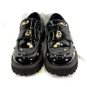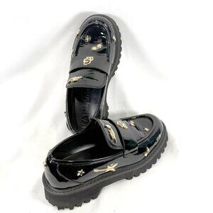 Crafted in glossy black patent leather, these loafers feature unique gold-tone studs (stars, guitar, music note, and more) that add a playful, chic edge.