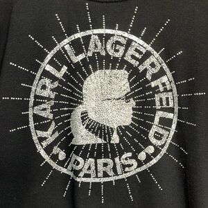 Stylish black sweatshirt featuring a striking metallic silver and rhinestone Karl Lagerfeld logo design.