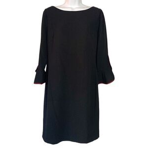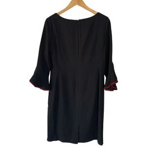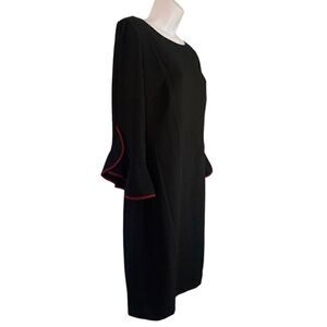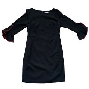 Karl Lagerfeld Paris black sheath dress. Size 8. New with tags. Features bell sleeves with maroon trim, V-neck, and back zipper closure.