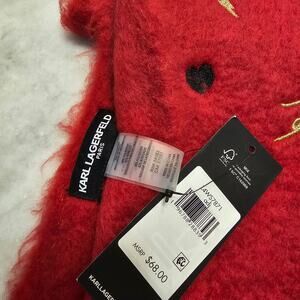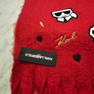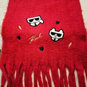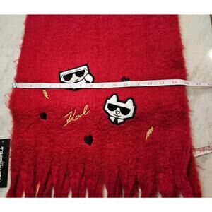 Karl Lagerfeld Paris Red Fleece Embroidered Fringed Long Blanket Scarf / Wrap NWT Fuzzy Chunky with Terry Patches of cat motif - Choupette wearing sunglasses
