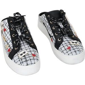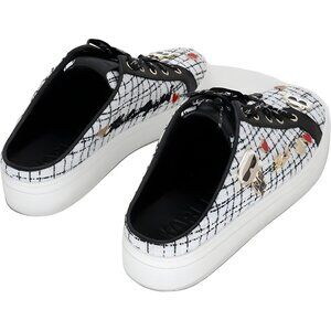 Playful mule sneakers featuring a tweed grid print with heart and sunglasses appliqués. Cushioned platform soles keep steps light.