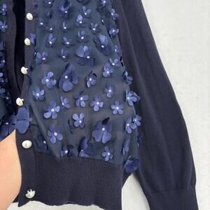 Karl Lagerfeld Paris Cardigan Sweater Size L Blue Sheer Front 3D Flowers