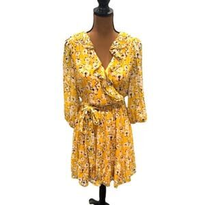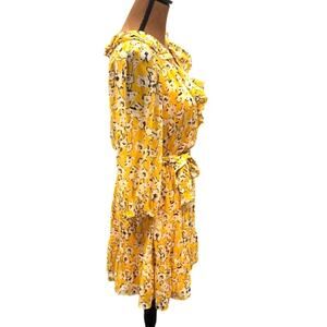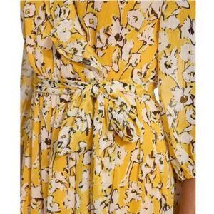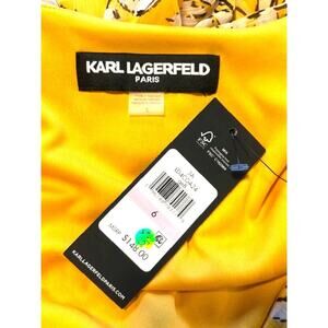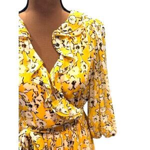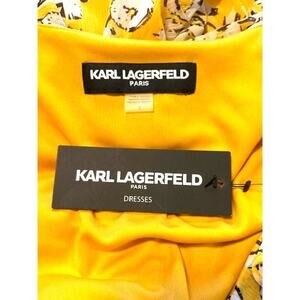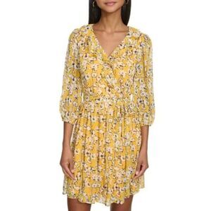 Elevate your wardrobe with this vibrant yellow chiffon dress from KARL LAGERFELD PARIS, featuring a flattering V-neckline, 3/4 sleeves, and a chic tie waist for the perfect silhouette. Delicate ruffle details and a graceful floral print add a touch of elegance, making it an effortless statement piece for any occasion.
