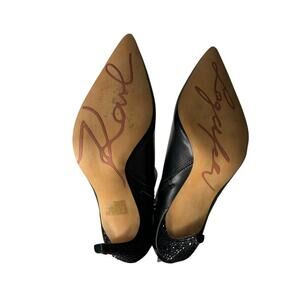 Karl Lagerfeld Paris Clea Leather Embellished Ankle Boots in Black. Size 6. Features pointed toe, embellished stiletto heel, leather and synthetic upper, leather lining and sole, and side zipper closure. Excellent pre-owned condition.