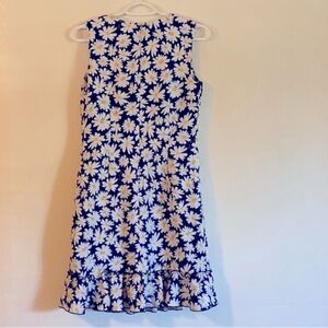 Chest 28” Length 35” Karl Lagerfeld Paris Dress Blue Yellow Floral Lined Bottom Ruffles Back Zipper Sz 2 (see pics lining has seam that needs repair)