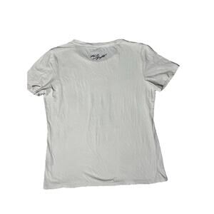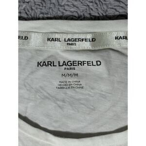 Adorable Karl Lagerfeld Paris iconic doll graphic logo cat choupette shirt in women's size M. This white t-shirt features a solid pattern, short sleeves, crew neck neckline, and a casual sleeve style. With a Paris theme, this basic shirt is a stylish addition to any woman's wardrobe, showcasing the iconic cat choupette and bringing a touch of Parisian chic to any outfit.