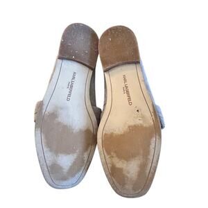 Karl Lagerfeld Paris Lynette loafters with tan suede upper material, toe square slip ons. They do show some wear on the inside, please see photos.