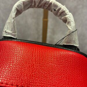 Front zipper pocket. Large interior area. Faux Leather. Nylon adjustable straps for comfort. Black and silver hardware.