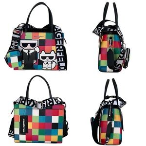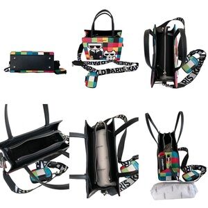 Stylish satchel bag with a vibrant multicolor design. Features iconic Karl Lagerfeld and his cat Choupette in raised 3-D graphics. Comes with a matching mini keychain change purse. Strap is adjustable and removable. Interior has zip up pocket, 3 card slots and open pocket. Minor manufacturer flaws on mini keychain purse and minor marks on exterior. Comes with original tissue paper. See all photos.