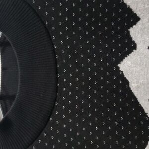 Sleeves, upper front and entire back have a white pattern on solid black