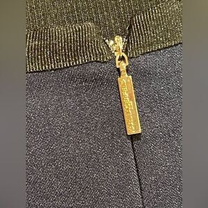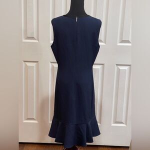This elegant navy sleeveless dress by Karl Lagerfeld Paris exudes timeless sophistication. Featuring a delicate ruffle hem, grosgrain ribbon detailing, and a charming bow accent at the neckline, this dress is perfect for office wear, cocktail parties, or special occasions.