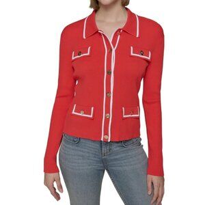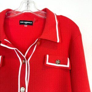 Chic and sophisticated Karl Lagerfeld Paris red orange cardigan sweater jacket in size Medium. Features a textured knit with gold-tone logo buttons, contrast white trim, and four faux pockets for a tailored, blazer-inspired look. Collared neckline and full button front closure give it a polished, Chanel vibes aesthetic. Made from a comfortable and structured 70% cotton / 30% nylon blend. Perfect for work, dinner, or elevating casual looks.