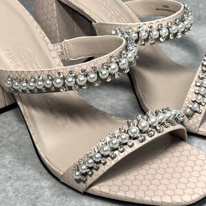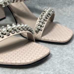 A snakeskin-patterned block heel lends fierce grounding to this dual-band sandal shimmering with dainty rhinestones and imitation pearls.