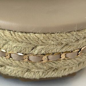 This style features a quilted upper with the Karl Lagerfeld logo and a platform sole with an espadrille-style trim. The platform with a chain embellishment, and a jute-wrapped espadrille sole.