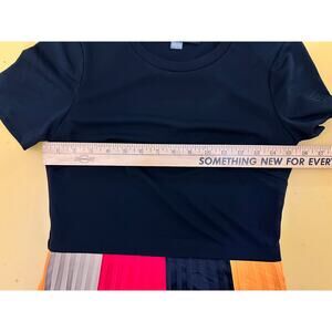 • Color: Black bodice with multicolor colorblock pleated skirt