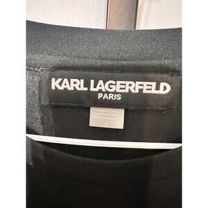 Make an unforgettable entrance in this striking Karl Lagerfeld Paris midi dress, brand new with original tags attached. Designed with a sleek black short-sleeve bodice and a dramatic colorblock pleated skirt, this dress blends modern sophistication with bold, fashion-forward flair.