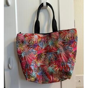Color: Multicolor tropical leaf print (reds, pinks, yellows, greens) with black handles