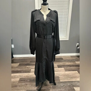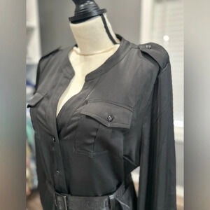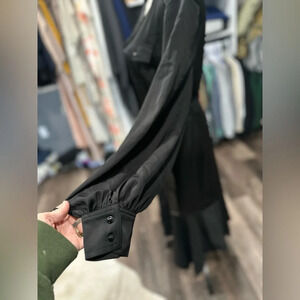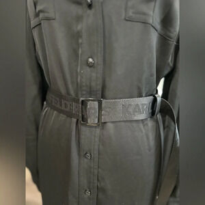This Karl Lagerfeld Paris dress is a black, long sleeve sport dress in size small. It features a V-neckline, button and buckle accents, and a midi length. Made of polyester, it has a blouson style and is suitable for casual occasions with a Paris theme.