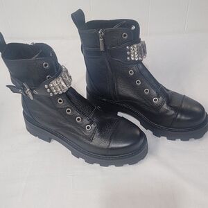 New Without Tags Karl Lagerfeld Paris Women's Maeva Combat Boot Embellished With Crystal Buckles Size 7.5. Trimmed with grommets for a laced up look. Rugged 1 1/2 block heel, round toe. I ner zipper closure, moto inspired drtail, leather upper, polyester fabric lining, rubber/ plastic sole.