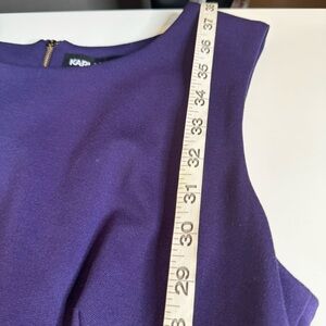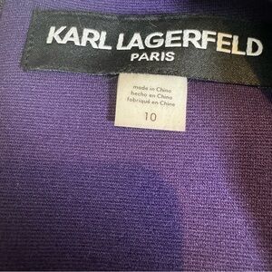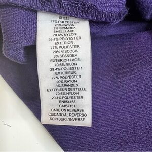 Karl Lagerfeld Paris Women's Purple And Black Lace Inset Sheath. Purple And BlackSheath Dress Zip closure Round Neck. 77% Polyester, 20% Rayon, 3% Spandex. Shell Lace: 70.6% Nylon, 29.4% Polyester