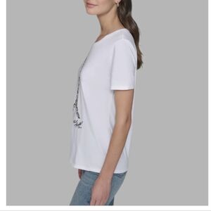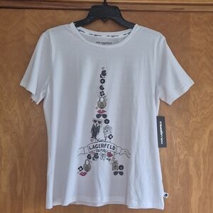 Karl Lagerfeld Paris Women's White Tee with Graphic Design, size L Chic Karl Lagerfeld Women's tee. Features playful graphic. Soft and comfy fabric.