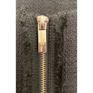 Karl Lagerfeld Paris tweed jacket with fringe. Has no flaws, jacket is in great condition. Center zipper closure. Zip cuffs. Tweed long sleeve jacket with fringe exposed detail.