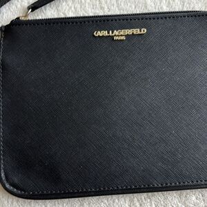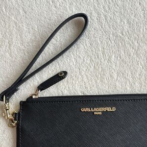 Karl Lagerfeld Paris Textured Black Faux Leather Wristlet Gold Tone Logo