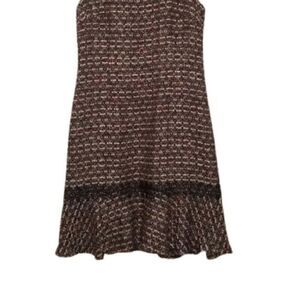 Lovely sleeveless multicolored tweed shift dress. Scoop neckline. Black lace appliqué around the collar and below the waist. Princess seaming. Flared bottom. Gold zipper down the back. Fully lined.