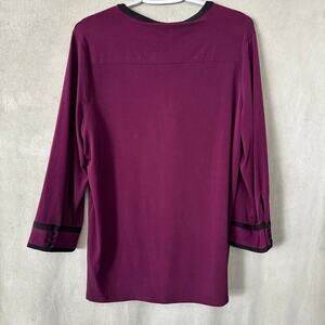 Elegant purple blouse with black trim. Features buttoned neckline. Three-quarter sleeves.