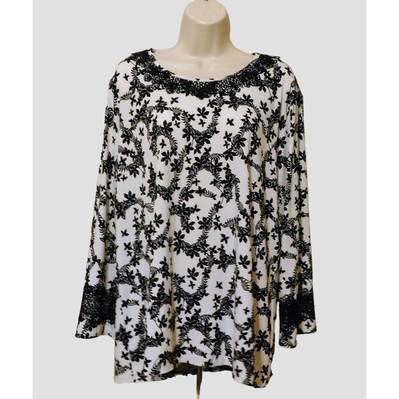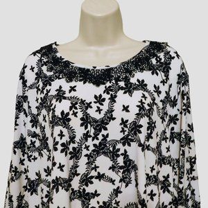 Karl Lagerfeld Shirt XL Black White Floral 3/4 Sleeves Lace Trim Polyester Blend