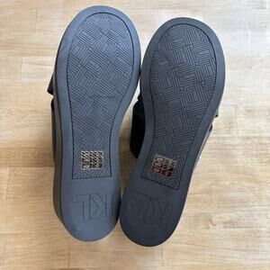 The Caleigh X Band Wedge by Karl Lagerfeld Paris showcases the brand's iconic pin hardware and provides the convenience of slip-on flexibility. Designed for both style and comfort, it features a cushioned heel and an elevated platform height, making it a perfect choice for all-day wear.