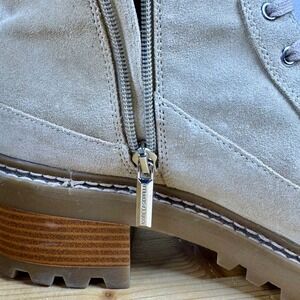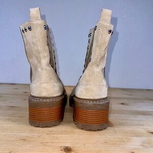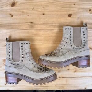 Designer combat boots by Karl Lagerfeld Paris, style BRECK/F22, in soft beige suede. Gunmetal stud embellishments, side zip, and elastic side panels. Lug sole with stacked block heel (~2"), US 9M / EU 40. Suede upper, man-made balance. Excellent condition with minimal wear. Sleek, edgy, and runway-inspired — pairs effortlessly with dresses, denim, or leather. Originally retailed $150+. Ships fast from a smoke-free home!