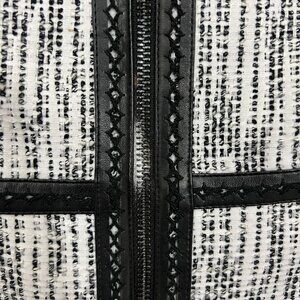 Unleash your inner fashionista with this Karl Lagerfeld jacket. Black and white tweed ensures you’ll be the star of any monochrome party. Zip it up for mystery, or leave it open to invite curiosity. Either way, style points will be earned.