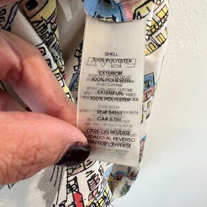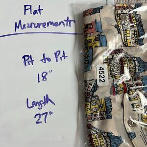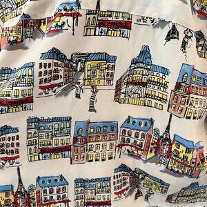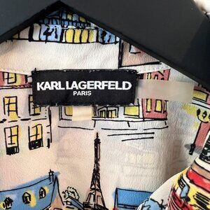This stunning shirt is an icon of Karl Lagerfeld. Safari style with front pockets, roll tab sleeves, lightweight, which brings versatility. Then a fun print with iconic scenes from Paris. Relaxed fit, no stains or tears. (1st pic shows how sleeves look both rolled up and let down)