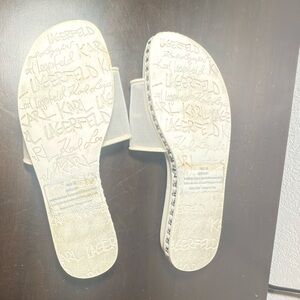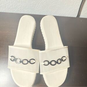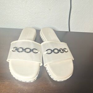 Stylish white sandals with black chain detail. Comfortable slip-on design. Perfect for casual wear.