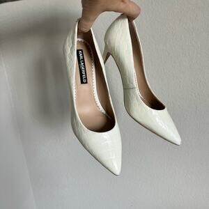 Karl Lagerfeld White and Cream Snake Print Pumps - Size 8 - patent leather upper - 3.25" heel - Pointed toe - Excellent condition with scuff on toe on left heel (see last pics)