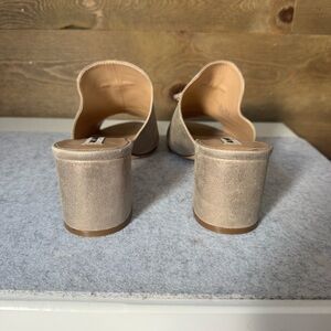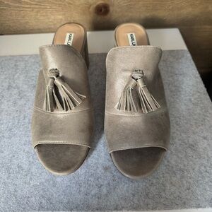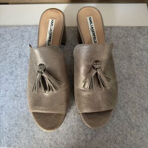 Step out in these classy gold metallic mules from Karl Lagerfeld. Featuring elegant tassel details, these shoes are perfect for any occasion. They have 2.25 “ heel and are made for comfort and style. New with tag on bottom of shoe with no box.