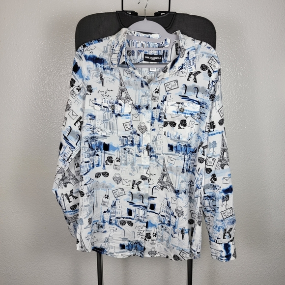 Karl Lagerfeld Women's Love From Paris All Over Print LS Button Up Shirt Sz S