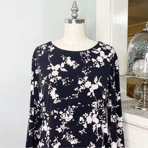 Karl Lagerfeld Yessie Trumpet Sleeve Knit Top Floral Blouse. Floral print with shades of pink, white and gray. Pearl button keyhole closure in back. 3/4 length layered trumpet bell sleeves. Size medium. New with tags.