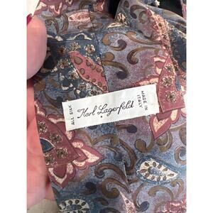 Karl Lagerfeld 100% silk necktie in excellent condition. Paisley print in blue, purple, brown, pink and off white. Measures 60” long.