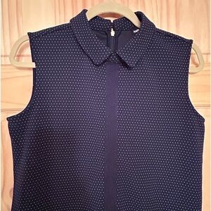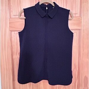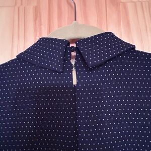 Beautiful navy blue polka dot top Machine washable Buttons in back In excellent condition Should to hem measures 25 inches