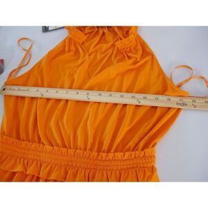 Keywords: Karl Lagerfeld orange maxi dress, sleeveless summer dress, tiered ruffle hem, split neck flowy dress, elegant boho maxi, ankle length orange dress, size M casual resort style