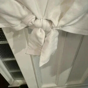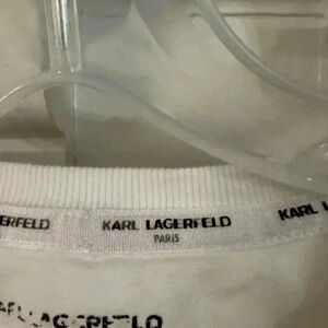 Karl Legerfeld Paris white 3/4 sleeve pullover with silver buttons and tie waist