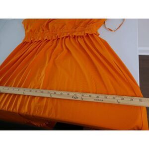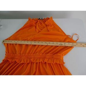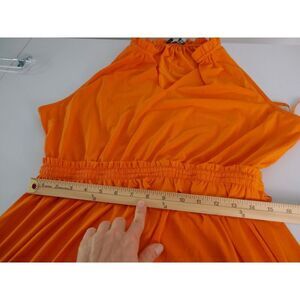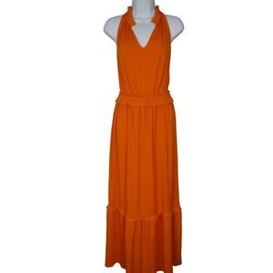 Keywords: Karl Lagerfeld orange maxi dress, sleeveless summer dress, tiered ruffle hem, split neck flowy dress, elegant boho maxi, ankle length orange dress, size L casual resort style