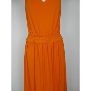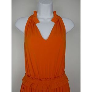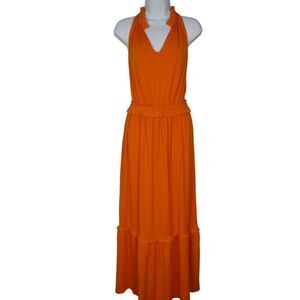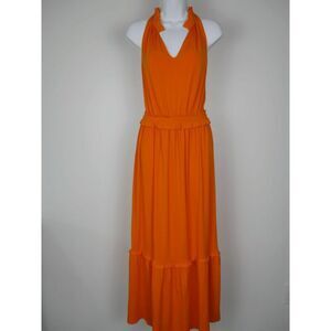 Keywords: Karl Lagerfeld orange maxi dress, sleeveless summer dress, tiered ruffle hem, split neck flowy dress, elegant boho maxi, ankle length orange dress, size S casual resort style