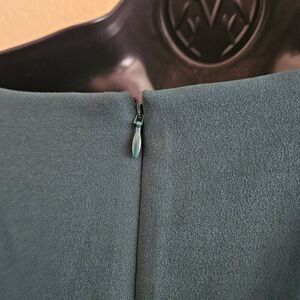 This is a knee-length, emerald green dress by Karl Lagerfeld. It features tulip style sleeves and a zipper on the back.