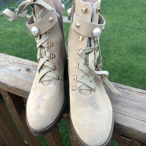 Karl Lagerfeld leather lace up boots have pearl like and gold stud embellishments. Side zip closure and a nice thick sole. Comfy and stylish. Some minor signs of wear but still in good condition. Boot is 9in height with heel, size 10