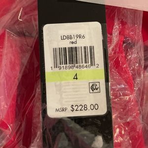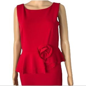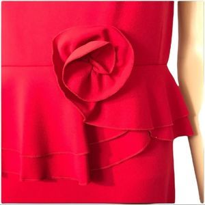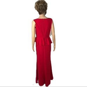 Beautiful true red gown. Perfect for any special occasion. Double ruffle peplum with rosette detail. Bottom flares out giving it an understated mermaid silhouette.