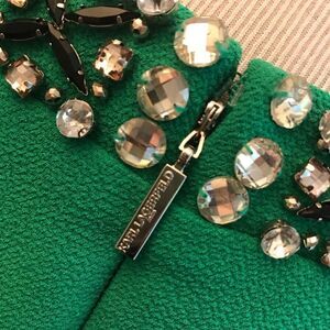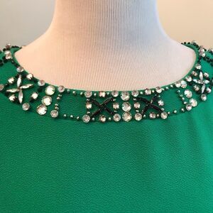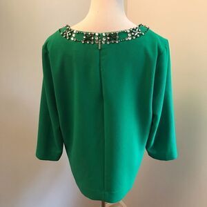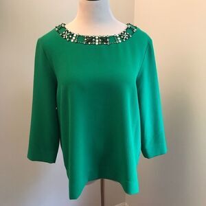 Karl Lagerfeld top in kelly green with embellished neckline, hidden back zipper and overall stretch. Armpit-to-armpit 22”, sleeve 19” and length 25”.