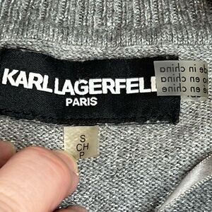 Karl Lagerfeld metallic silver cowl neck sweater with kangaroo pouch size S. Style L5JSD700. Very good condition. 50% cotton 30% viscose 16% polyester 4% metallic. Good condition. Length 25” Chest 17”.